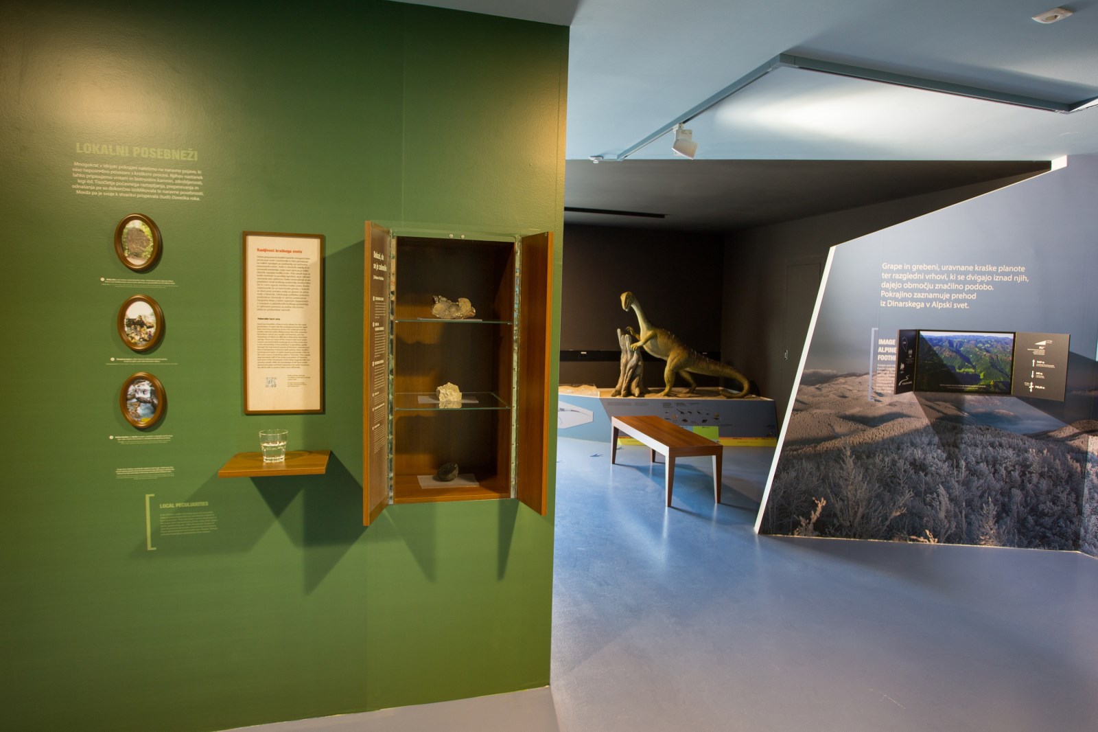 V razstavi Zapisano v kamninah so poleg geološke zgodovine in procesov, ki soustvarjajo naš planet, predstavljene kamnine in fosili, živalstvo in rastlinstvo geoparka, kraški svet s svojimi pojavi ter kulturne značilnosti Idrije in slikovitega idrijskega podeželja. Osnova te stalne razstave sta tektonika in njena pomembna vloga pri oblikovanju območja, kjer se nahaja tudi slavno živosrebrovo rudišče. Tektonski pojavi, med katerimi je na Idrijskem najpomembnejši idrijski prelom, so pomembno vplivali na naravo, kamnine, prst in pokrajino ter posledično na zgodovino in način življenja, celo na karakter tukajšnjih prebivalcev.