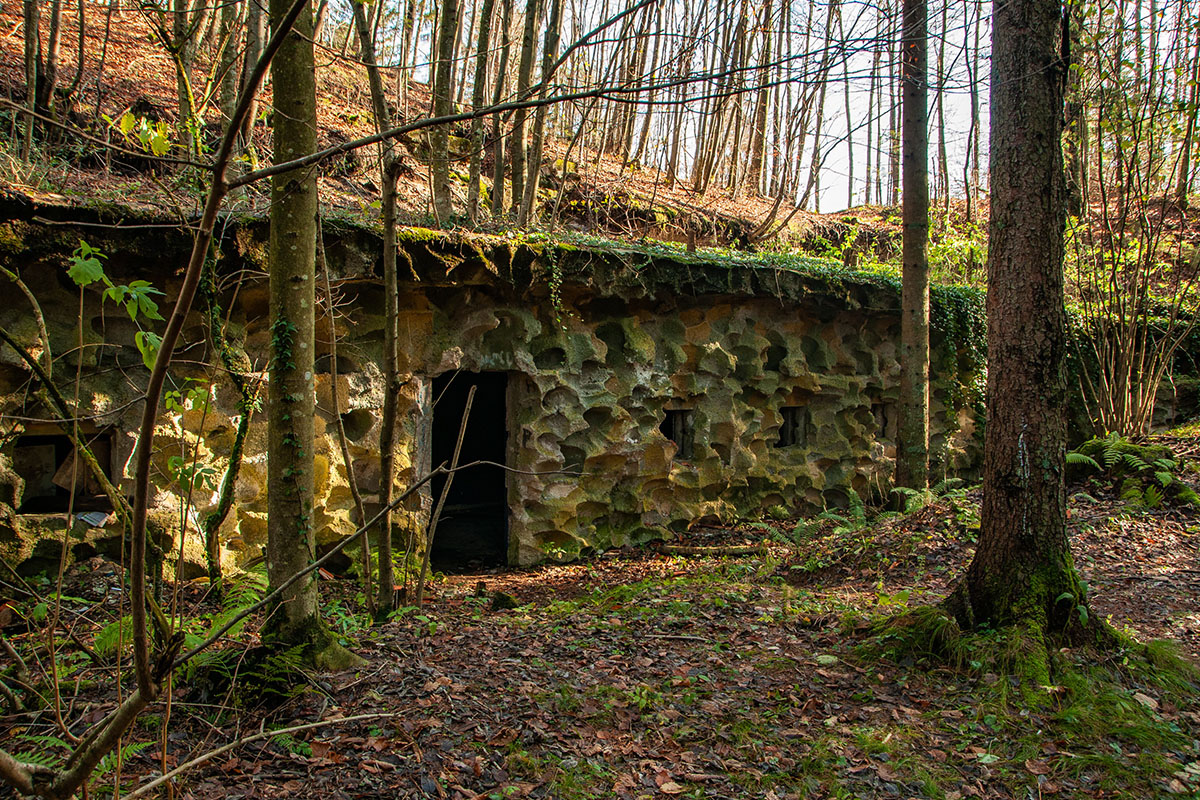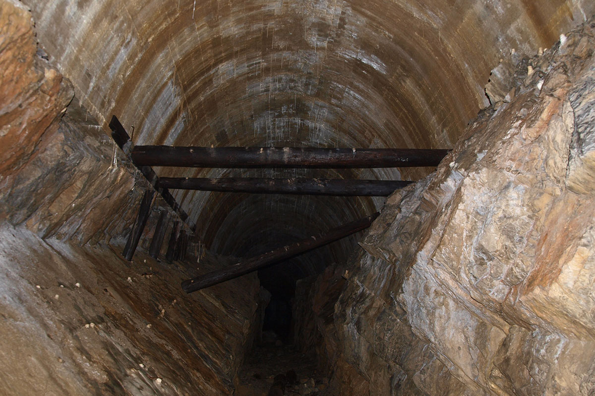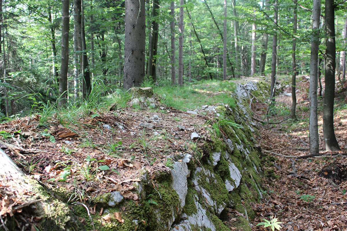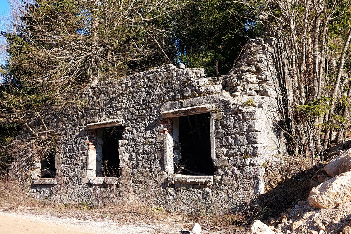Ob vzpenjajoči se cesti na levi strani opazite več ostankov objektov, ki jih je italijanska vojska gradila ob koncu 20. let prejšnjega stoletja v okviru obrambnega sistema Alpskega zidu. Nadaljujte naprej po poti mimo kamnoloma do glavne ceste. Pri glavni cesti stojita usmerjevalni tabli. Za ogled ostalin nedokončanega železniškega predora iz leta 1917 greste levo po gozdni cesti, ki poteka vzporedno z glavno cesto. Po 100 m opazite izsek, ki je bil vklesan za železnico. Če se obrnete levo v smeri izseka, boste v dolžini 50 m opazili vhod v predor, ki je slabo viden. Skoraj 400-metrski nedokončan predor je prava tehnična znamenitost, vredna ogleda. Vrnite se po isti poti nazaj do glavne ceste in zavijte desno po glavni cesti.