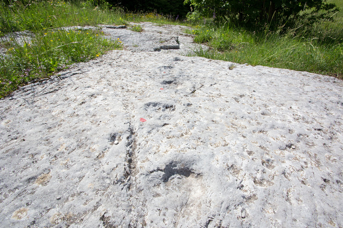 Kmalu boste na planotasti ravnici opazili kmetijo Pesek z veliko anteno. Če se pri kmetiji usmerite desno po travniku navzgor, pridete ravno do ohranjenih odtisov predhodnika dinozavra.