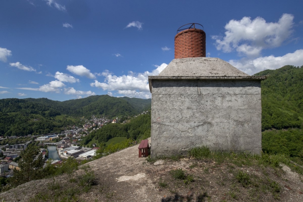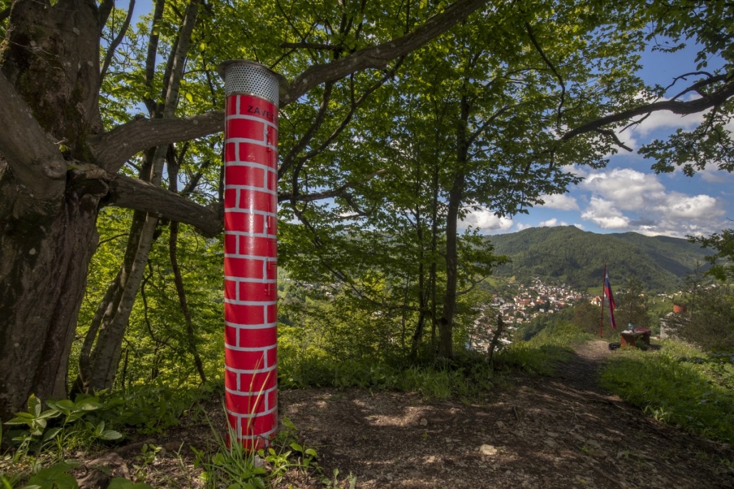 Opis poti: S parkirišča pot nadaljujete v smeri Topilnice Hg: mimo cerkve sv. Jožefa delavca in trgovine Merkur ter nato v križišču zavijete desno, na Rudarsko ulico. Ko pridete do konca znamenitih rudarskih blokov (t. i. prhausi), pri planinski markaciji zavijete levo in nato še v ostrem ovinku desno po strmem klancu navzgor. Na vrhu klanca zavijte ostro levo in pot nadaljujte po ravnem. Pri zgornji postaji tovorne žičnice topilnice pri oznaki zavijte desno v hrib. Poti sledite levo po pobočju in nato po približno 0,5 km zavijte ostro desno proti dimniku. Po 20 min hoji prispete do topilniškega dimnika, kjer se vam odpre lep razgled na mesto Idrija.