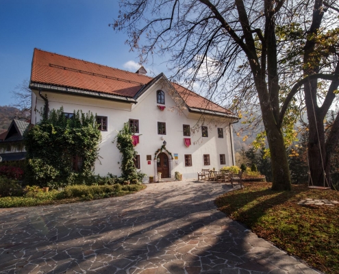 To get back to the starting point, take the same road back to the first crossing and keep to the right. Follow the asphalt road to the farm where the road begins to descend and gradually turns into a gravel road. After several minuts of walking, you reach Šnitov rob (the path to the right leads to the panoramic point), where the serpentine road continues to lead you downwards. After approximately 10 minutes of walking, you will reach the orchard at Staje. Continue past the house, across the stream, and past the Stajer farmstead (a renovated house with a stable and hayrack). After several hundred meters, the road forks to the right toward Merkejce. Continue straight ahead on the gravel road. After approximately half an hour of walking, you will reach the Trne farmstead and the first houses. Take a right turn across the meadow and follow the asphalt road. At the fork in the road, keep to the left and descend downwards. On your right, you should have the Kopa hill, and on your left, a meadow with a small hayrack. At the crossing, keep to the right, and after several hundred meters you will reach the starting point in the old town center of Spodnja Idrija.