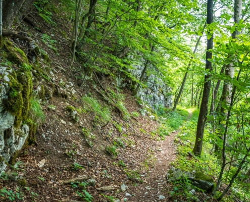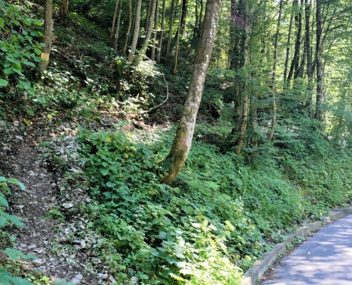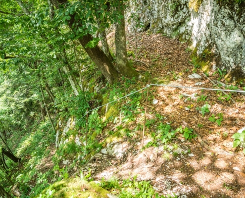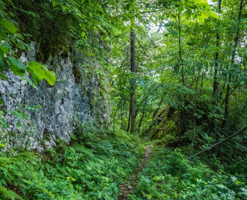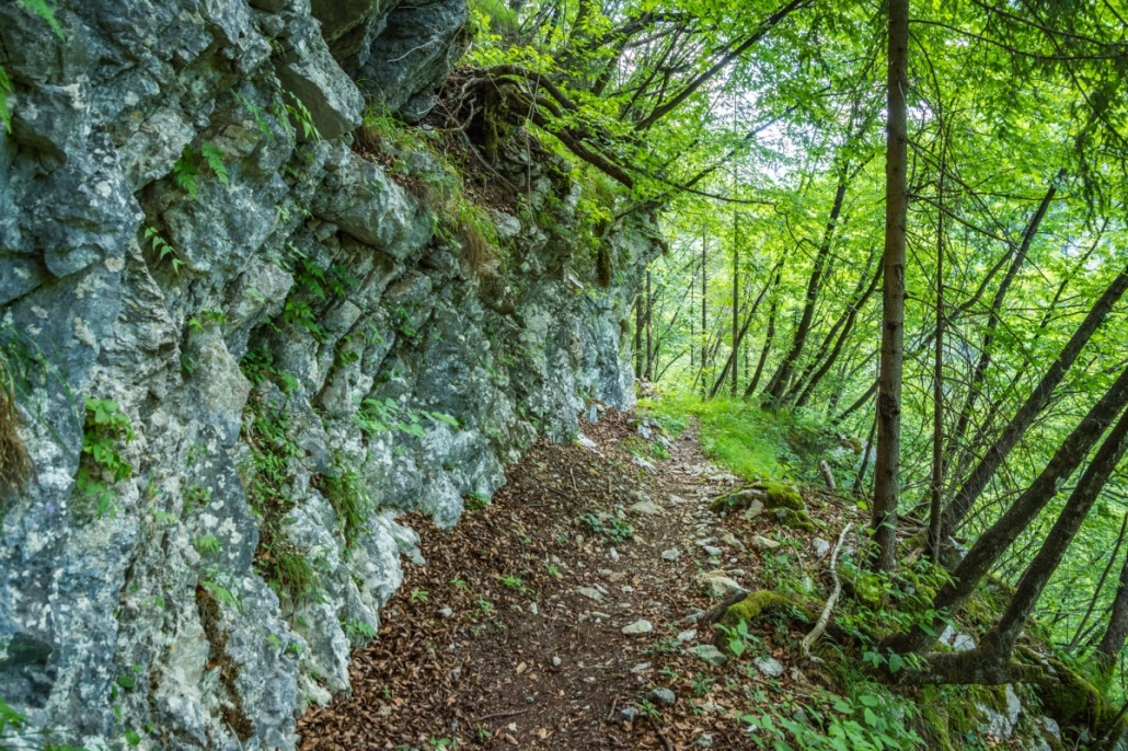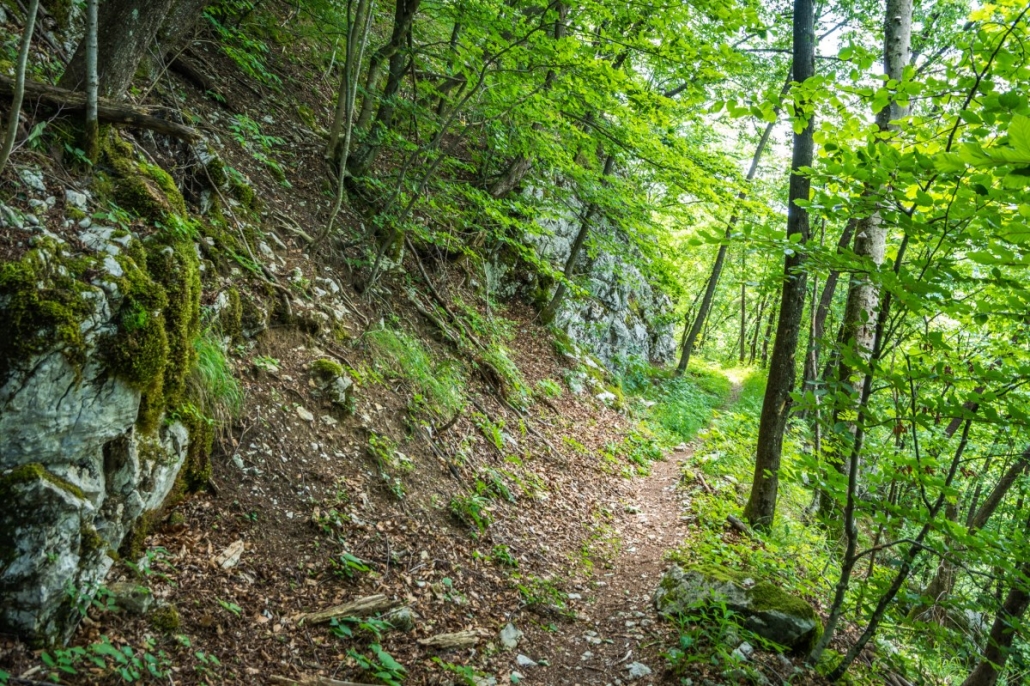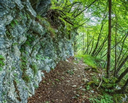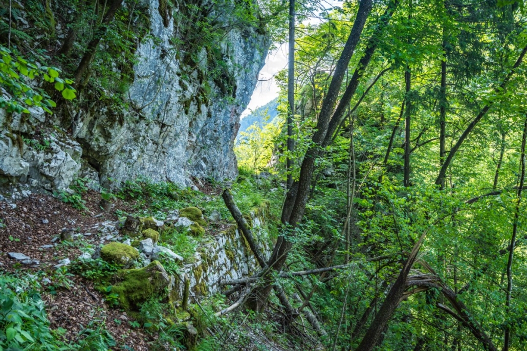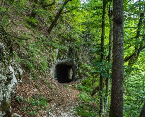 Trail description: From the Wild Lake, take the asphalt road towards Idrijska Bela. After approximately 1.5 km, you will reach the third marked road shoulder and, on your left, you will see a wooden sign with the Feldban logo hanging on a tree. Turn left and take the path uphill, following the Feldban marks. Continue on the forest road that constantly leads upwards. After a few minutes, you will transverse the steep hill with the help of a wire rope and pitons. When you reach the next crossroads, continue straigh ahead on the gently sloping path (the steep marked path will lead you into the Idrija-Cerkno alpine road). The road will eventually take a sharp left turn and then gradually slope up. When you reach the next wire rope, turn left and take the path downwards where you will soon see a red metal ladder. A wooden bridge used to stand here during the time of the narrow-gauge railway. You will soon reach a 25-m tunnel. Continue on the gradually sloping path which will widen into a macadam road and reach the main macadam road Idrija (Podroteja)–Idrijski Log. At the crossroads, turn left and descend the road that will lead you though 12 sharp turns back down to the Idrijca River Valley. When you reach the familiar Podroteja asphalt road, turn left towards the Wild Lake at the Geopark information board. If you started your hike in Idrija, proceed from the Wild Lake to the hanging bridge, cross it and walk along Rake to your starting point.