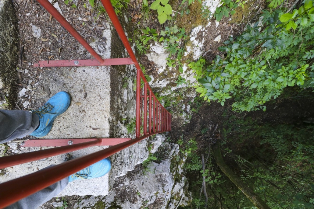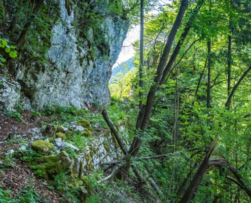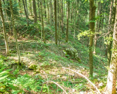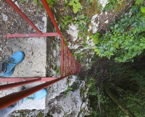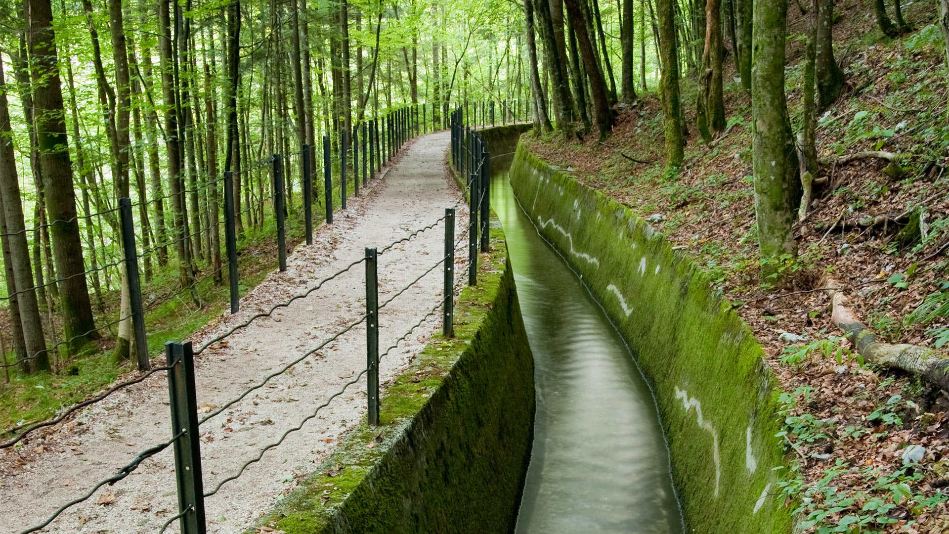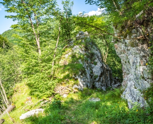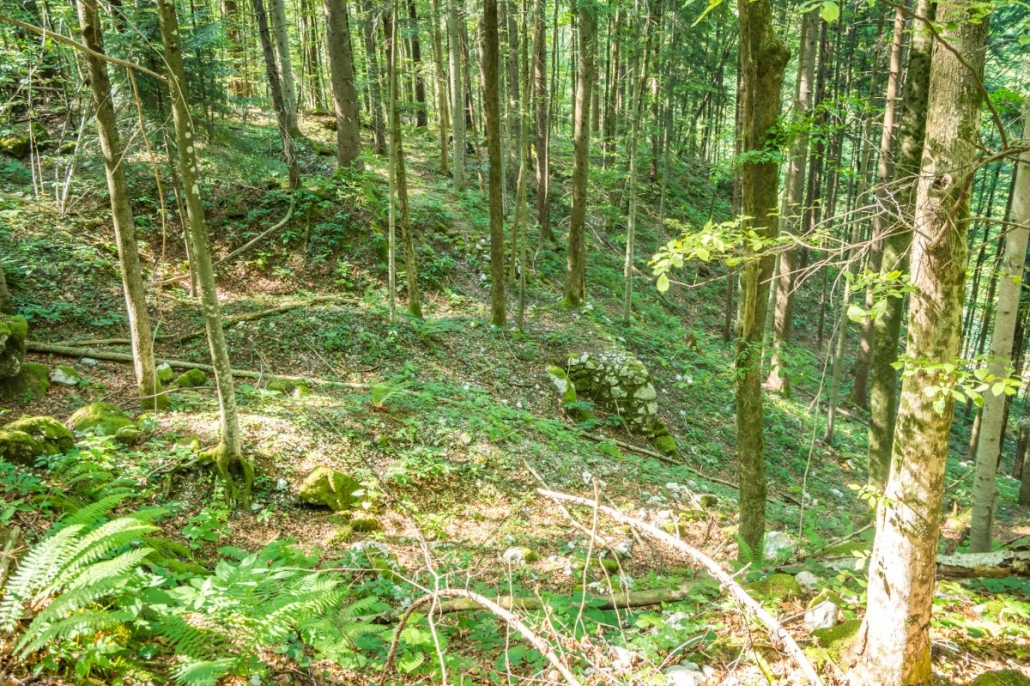 Trail description: From the Wild Lake, take the asphalt road towards Idrijska Bela. After approximately 1.5 km, you will reach the third marked road shoulder and, on your left, you will see a wooden sign with the Feldban logo hanging on a tree. Turn left and take the path uphill, following the Feldban marks. Continue on the forest road that constantly leads upwards. After a few minutes, you will transverse the steep hill with the help of a wire rope and pitons. When you reach the next crossroads, continue straigh ahead on the gently sloping path (the steep marked path will lead you into the Idrija-Cerkno alpine road). The road will eventually take a sharp left turn and then gradually slope up. When you reach the next wire rope, turn left and take the path downwards where you will soon see a red metal ladder. A wooden bridge used to stand here during the time of the narrow-gauge railway. You will soon reach a 25-m tunnel. Continue on the gradually sloping path which will widen into a macadam road and reach the main macadam road Idrija (Podroteja)–Idrijski Log. At the crossroads, turn left and descend the road that will lead you though 12 sharp turns back down to the Idrijca River Valley. When you reach the familiar Podroteja asphalt road, turn left towards the Wild Lake at the Geopark information board. If you started your hike in Idrija, proceed from the Wild Lake to the hanging bridge, cross it and walk along Rake to your starting point.