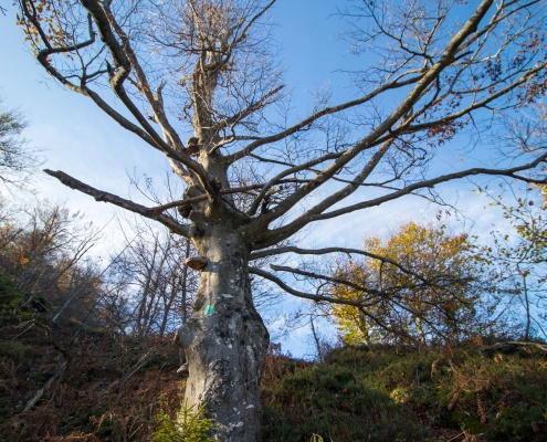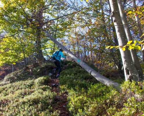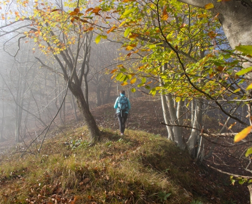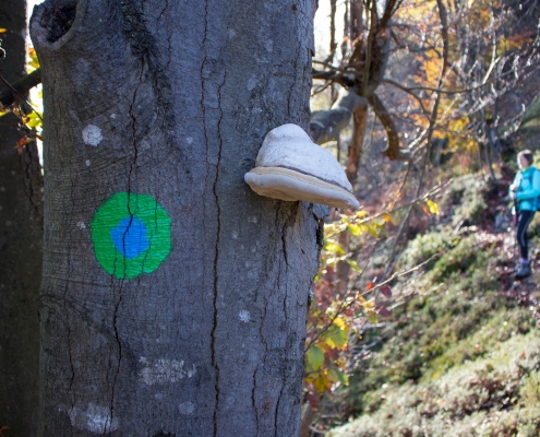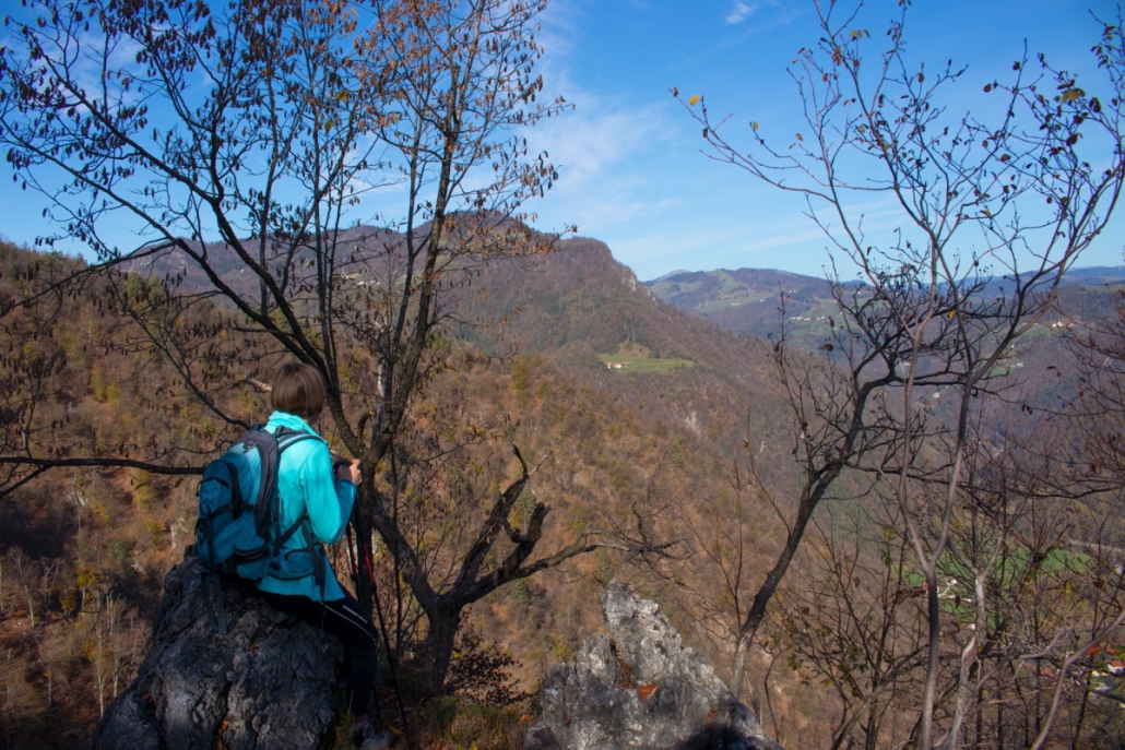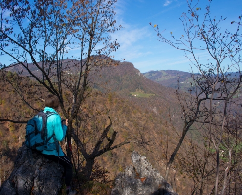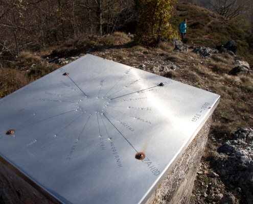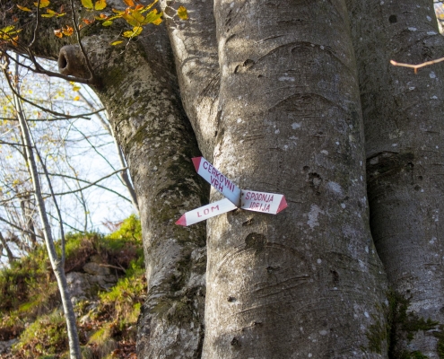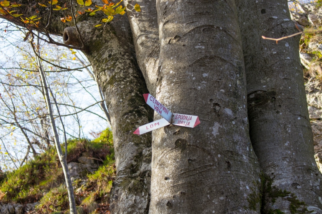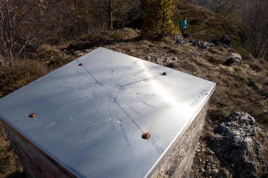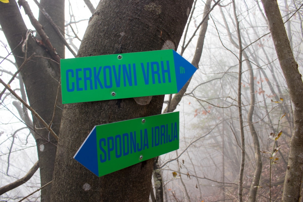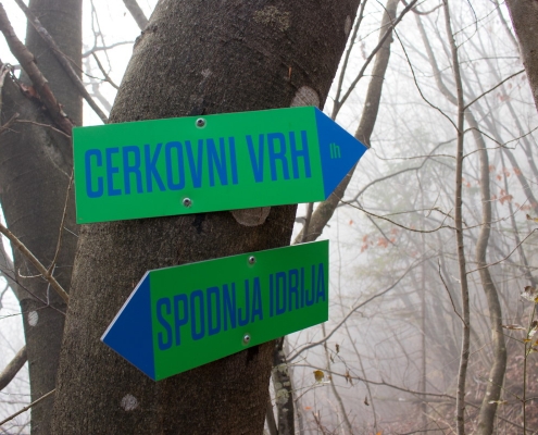 Trail description: From the bigger parking lot next to the Spodnja Idrija House of Culture, cross the road and go to the staircase leading up to the church. You will see markings for Kuncl and Cerkovni Vrh. Follow the markings to the left past the church, past the chapel of rest to the top of the cemetery. Go through the iron gate and onto a path leading uphill. The path will soon turn left and ascend past a wooden stable. When you reach a crossroads, you can choose both possibilities: to the left, the trail will lead you to Kuncl, where you turn back towards the ridge and follow the markings; the trail leading straight ahead will also take you to the ridge in the direction of Cerkovni Vrh. Continue along the ridge. The trail will sometimes be very steep and will eventually circle to the left and then return to the right side of the ridge. Along the way, enjoy in the views of Spodnja Idrija and the surrounding hills. When you reach the pass, pay attention to signposts. On your right, signposts for Spodnja Idrija–Cerkovni Vrh–Lom will direct you to your left, onto a rocky path leading steeply uphill. In a few minutes, you will reach Cerkovni Vrh.