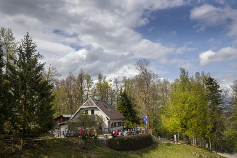 Trail description: From the parking lot, follow the road that leads to the town centre. Follow directions for Vojsko, past Anthony’s Main Road. You will reach the crossroads where the signpost leads left to Vojsko – go past it and past the famous Idrija bar 3×3. Just behind it, a blaze will lead you left through the narrow streets of Idrija toward Hleviška Planina. At the last houses of Čopičeva ulica, you can enjoy in a beautiful view of a large part of the town, while the road turns into a gravel road that will take you uphill to a nearby forest road that you reach at a small chapel on a crossroads. Turn right (straigh ahead is the Pšenk forest road) and you will very soon reach the next crossroads. Continue left on a steep path with markings for a hunting trail – lovska pot (if you continue straight ahead, you can reach Hleviška Planina via Kodrov Rovt). After a short steep ascent through a forest, the path becomes flatter. After a few minutes of traversing to your left, you will reach a relatively new forest trail that will lead you to a crossroads of several gravel roads. Continue to you right onto a wide footpath that will gradually ascend through the forest, past a wild garlic site, and past a bench, further to your left. Higher up, you will reach a small ridge with the path leading slightly to the right and uphill. After a short steep ascent, you will reach a poorly maintained forest road that you follow to the right. Higher up, you will join a wider gravel road that will soon lead you to a marked crossroads where you will be joined by the road via Kodrov Rovt). Continue straigh ahead on the road that is closed for public traffic. It will soon lead you out of the forest. Follow it until you reach the Hleviška Planina hut (5 minutes). Movement-impaired persons can ask for the ramp to be opened so that they can drive to the hut.