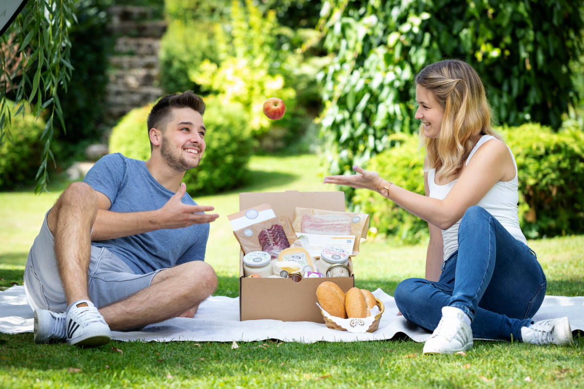 Idrija Breakfast for two contains: fruit- and plain yoghurt, cheese, minced lard, dried pork neck, pressed bacon, herbal tea, honey, butter, bread, and seasonal fruit.