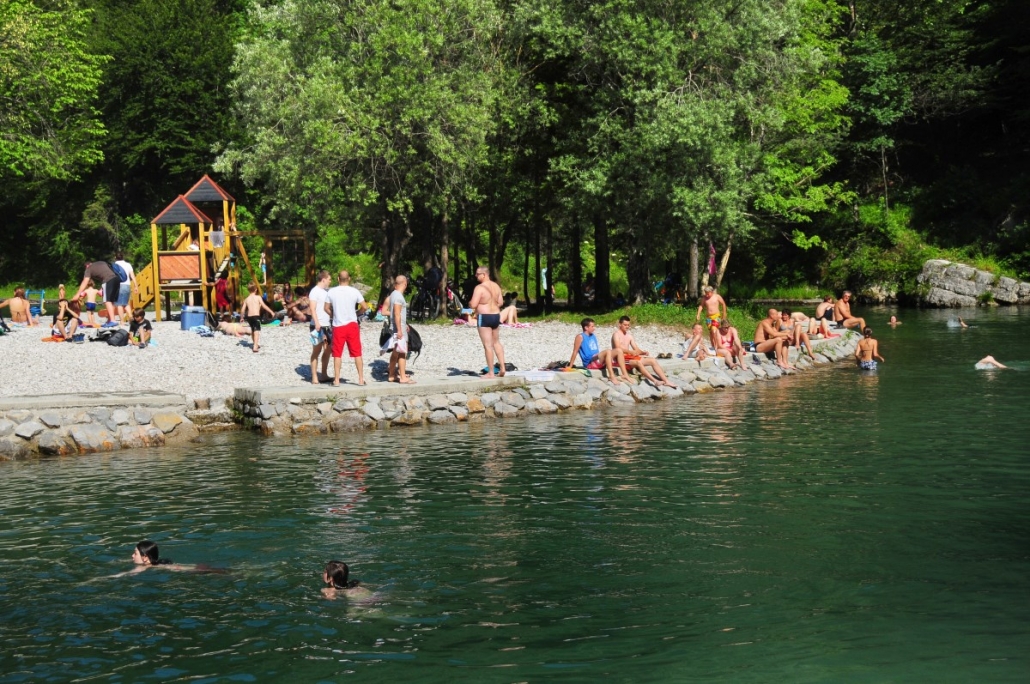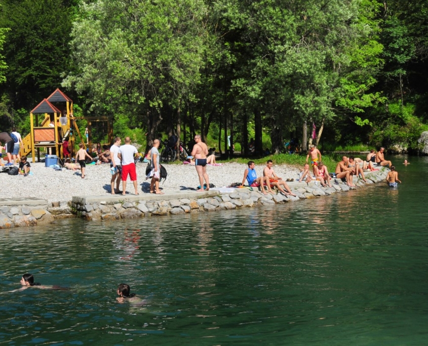 In the Upper Idrijca Landscape Park, you will find a beautifully maintained natural bathing area Lajšt on the confluence of Idrijca and Belca rivers. This calming environment is perfect for relaxing and enjoying in the rich pristine nature of the landscape park and its unique natural characteristics.