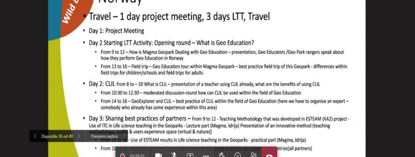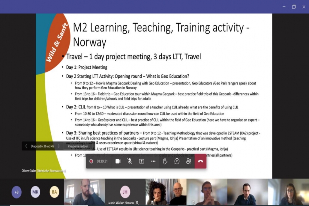 Uvodno srečanje projektnih partnerjev je potekalo 10. februarja 2022 v spletnem konferenčnem okolju. V okviru srečanja je vodilni partner Geopark Steirische Eisenwurzen predstavil vse predvidene projektne aktivnosti in izvajanje aktivnosti v prihajajočih mesecih. Velik del pa je bil namenjen spoznavanju in predstavitvam vseh sodelujočih geoparkov. Kljub temu, da se partnerji nismo uspeli spoznati v živo, smo pridobili vse potrebne informacije, ki jih potrebujemo pri našem nadaljnjem delu. Sodelavci Geoparka Idrija se že veselimo vseh projektnih aktivnosti in končnih rezultatov projekta, s katerimi bomo lahko nadgradili naše dosedanje izobraževalne aktivnosti in delo z različnimi šolskimi skupinami.